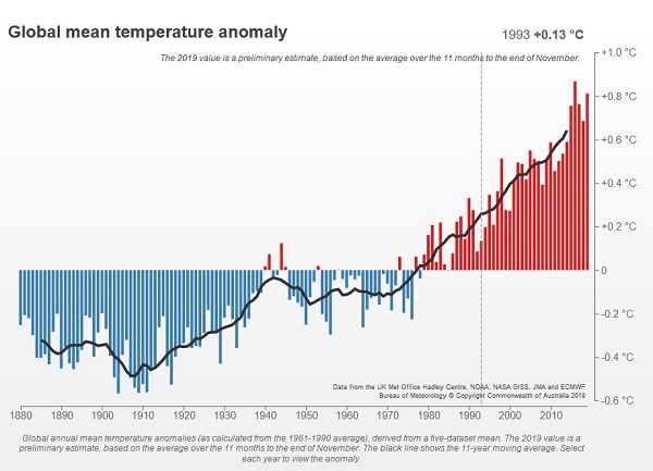 2019 named second-hottest year worldwide, WMO says. https://www.abc.net.au/news/2020-01-16/climate-report-finds-2019-second-hottest-year-on-record-wmo/11872344. The average global temperature in 2019 was ONLY 1.1 degrees Celsius above pre-industrial levels.”