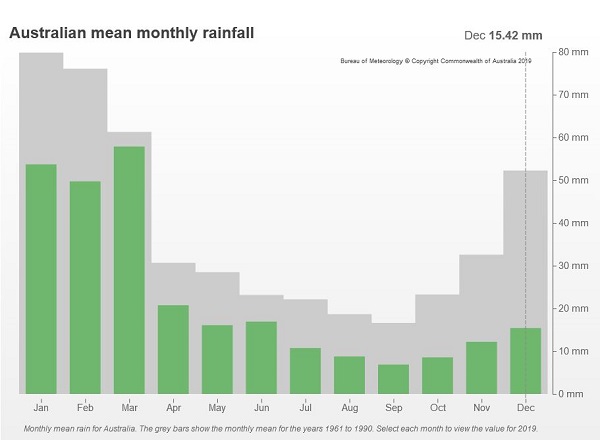 2019 was Australia’s driest year on record with nationally-averaged rainfall 40% below average for the year at 277.6 mm.