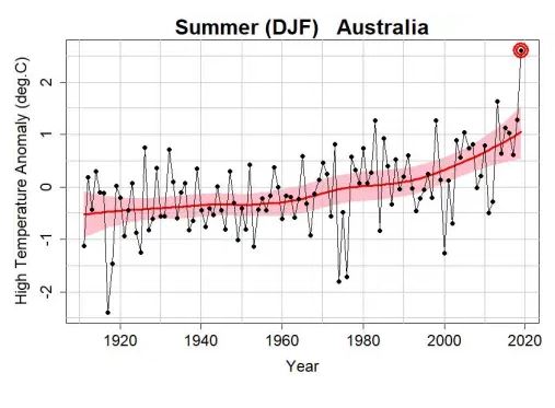 Australia’s climate has warmed by more than one degree Celsius over the past century, causing an increase in the frequency and intensity of heatwaves and droughts.[57] Eight of Australia’s ten warmest years on record have occurred since 2005.[58] A study in 2018 conducted at Melbourne University found that the major droughts of the late 20th century and early 21st century in southern Australia are “likely without precedent over the past 400 years”.[59] Across the country, the average summer temperatures have increased leading to record-breaking hot weather,[60] with the early summer of 2019 the hottest on record.[61] 2019 was also Australia’s driest ever year since 1900 with rainfall 40% lower than average.[62]