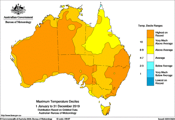 2019 was Australia’s warmest year on record. Australia’s area-averaged mean temperature for 2019 was 1.52 °C above the 1961–1990 average, well above the old record: +1.33 °C in 2013. Mean maximum temperatures were the warmest on record at 2.09 °C above average, also well above the previous record, which was +1.59 °C in 2013.
