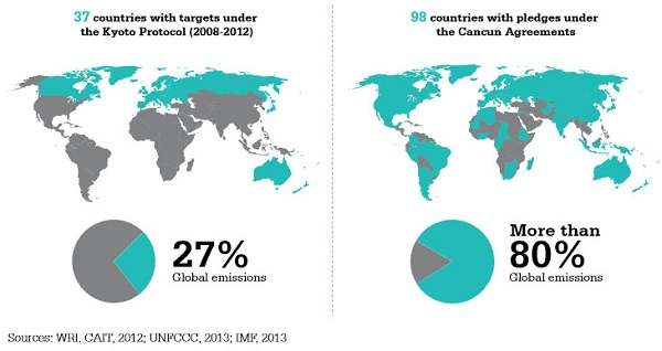This map shows the number of countries pledging action and the portion of emissions covered under the UN Framework Convention on Climate Change (UNFCCC):