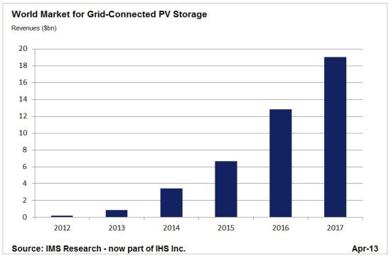 A new report by IMS Rsearch finds that PV storage to accompany PV rooftop solar is set to take off, according to Clean Technica also posted at at RenewEconomy. Two graphs tell the story. This one shows the expected world-wide growth forecast to reach $19 billion in 2017, from less than $200 million in 2012, led by subsidies in Germany: