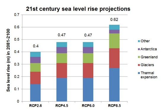 The first thing to note that the graph represents midpoints, not the worst case for each scenario. Secondly, as with the text the time frame is 2081-2100, effectively 2090 rather than 2100. Third it’s clear that the ice sheets are expected to play a minor role. The big surprise could come from Antarctica, where the ice is directly exposed to warming sea water, and giant glaciers, such as Pine Island.