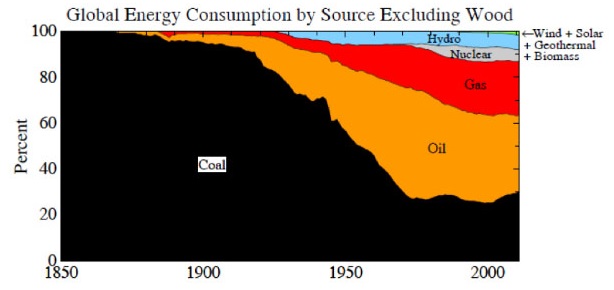 Of course, most fossil fuel reserves will need to be left in the ground. The paper charts the fork in the road in the energy system which began with the industrial era when coal increasingly took over from wood. The size of the task confronting us now is illustrated in this graph: