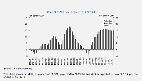 Commonwealth net debt stood at 12.5% of GDP in June. The following graph shows net debt projected out to 2013-24: