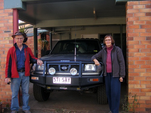 On Saturday 26 July, Len, Margot and I set out in Len’s X-trail with trailer to stay overnight with my elder brother Ron and his wife Lorna in Rockhampton. Thence on Sunday we proceeded to Emerald, where Len’s son Geoff lives. There we loaded up “The Beast” as we initially called it. Here we have Margot and me ready to go, with great expectations:
