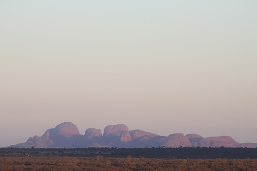 Len and I on different days took photos of the sunrise on Kata Tjuta with a zoom lens from over 40 km away at Uluru. This is Len’s: