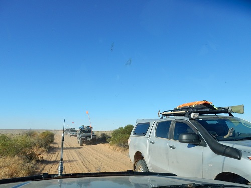 Later Don and Patsy’s vehicle dropped a chain into the sand, luckily spotted by Darral and Marion and picked up by Betty and Eoin. Don spent our morning smoko break re-attaching the offending chain.