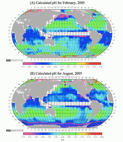 Apparently there has been no baseline data for ocean acidification, which varies around the world. Now a database of the current state of the ocean has been compiled. Here is a map showing the rough state of play:
