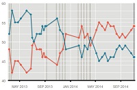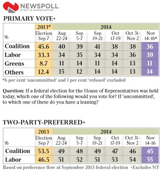 They say that all politics is local. In any case Abbott’s ventures into international politics in APEC and the G20 seem to have done him no good. Newspoll has the ALP 10 points ahead (55-45) on a two-party-preferred basis, with Labor’s primary vote ahead of the LNP for the first time since July. Shorten has edged ahead in the better prime minister stakes 43-39 with 20% uncommitted. For the tables go here.