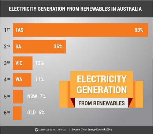 Only SA and the ACT have renewable energy targets – SA 50% of electricity by 2025, the ACT 90% by 2020. The current state of play is: