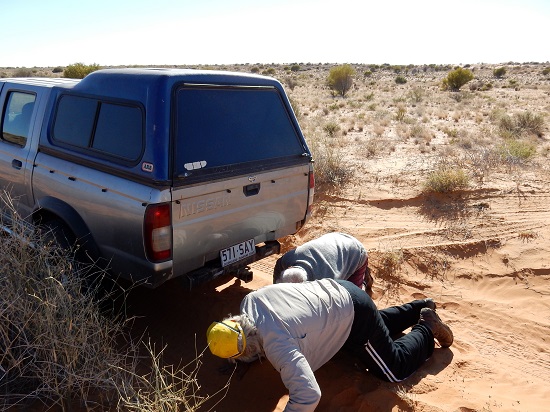 It didn’t stay that way, of course. From time to time some strange noises were emerging from the back of our vehicle. It sounded like a tyre scraping on the guard as we lurched through large potholes. Len and Darral decided to investigate. The next five photos record their thorough investigation, which the camera tells me took all of three minutes: