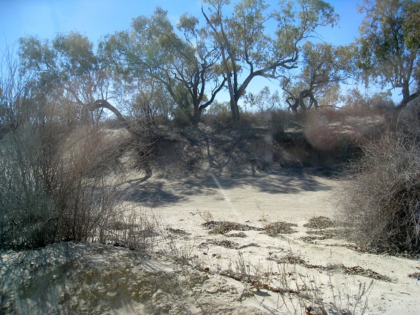 After lunch the interdune areas became grey and silty, rather than red. Then we came across the Eyre Creek, heavily incised into the inter-dune swale. Here’s a photo, actually taken soon after we met the walker (see below), but the periodic flooding explains the change in colouring and vegetation: