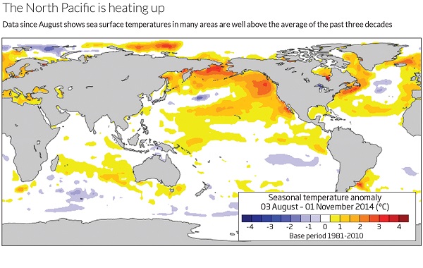 The world’s oceans are the hottest they’ve ever been in the modern record, especially in the northern Pacific.