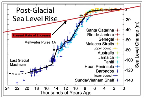 An explanation might be that SLR happens slowly and might take 3-6000 years. True enough but then we are forcing the system many times (25 to 30?) harder than it has been forced before. There is no precedent. And there has been a recent precedent for rapid SLR 14,000 years ago in what is called Meltwater Pulse 1A, when the waters rose a metre every 20 years for 400 years: