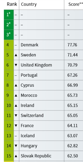 Clearly Europe is the best performing region. Here are the top dozen ranked countries: