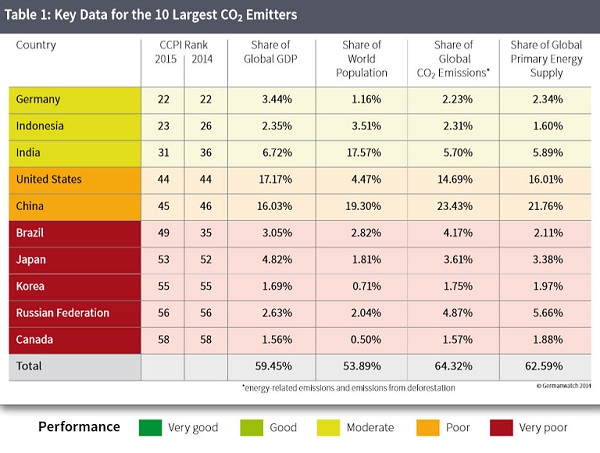 Australia ranks 57 out of 58 countries in the The Climate Change Performance Index 2015, heading only Saudi Arabia, which is not classified as an industrial country. Australia has dropped 21 places since the last survey a year ago.