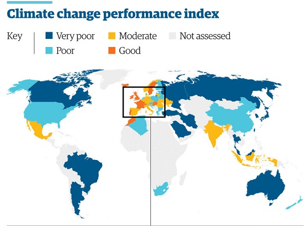 The index covers the performance of countries across five areas – the level of emissions, the trends in emissions, energy efficiency, renewable energy policies and the approach to climate change at national and international levels.