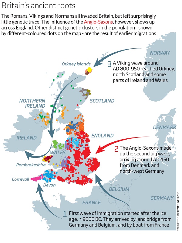 There were two main findings. First, the only invaders to leave a distinct genetic genetic footprint were the Anglo-Saxons in the east and the south, who arrived from AD 450. Still the DNA of earlier settlers dominates, with at least 60% deriving from earlier immigrants.
