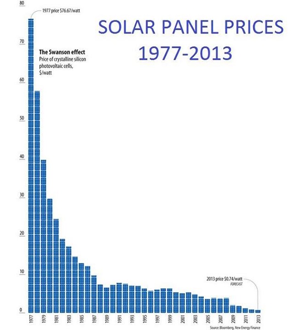To illustrate how economies of scale have led to lower prices, I’ll repeat here what was said in this post about the Swanson effect, whereby the cost of solar panels drops by 20% for every doubling of sales. This is how the cost reduction of solar panels looks from 1977 to 2013:
