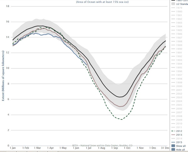 Brian: The graph you showed uses 15% ice cover as the dividing line for defining ice extent. It is a bit out of date with 2015 ice extent well behind record year 2012 extent.