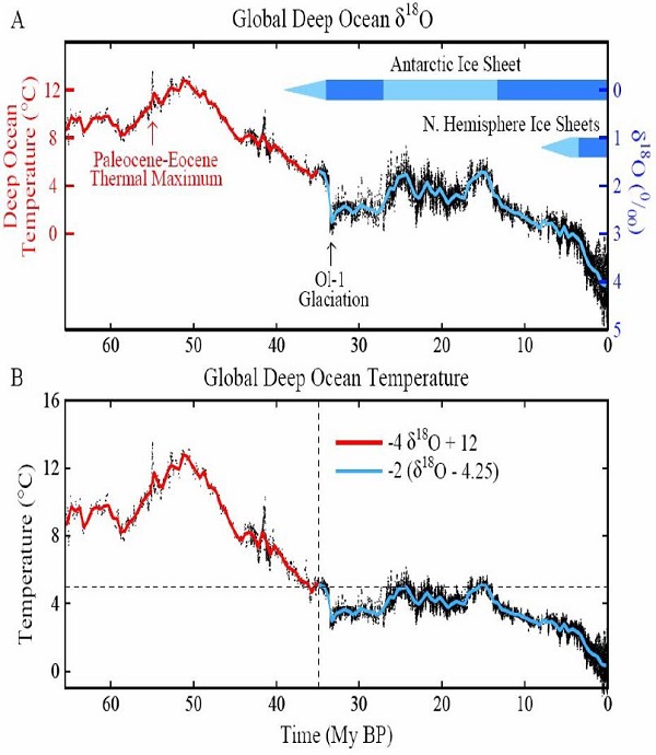 This graph, also from Hansen, shows the variation and cooling trend in the Cenozoic Era (last 65 million years), together with the introduction of glaciation, first in Antarctica, then in the Northern Hemisphere: