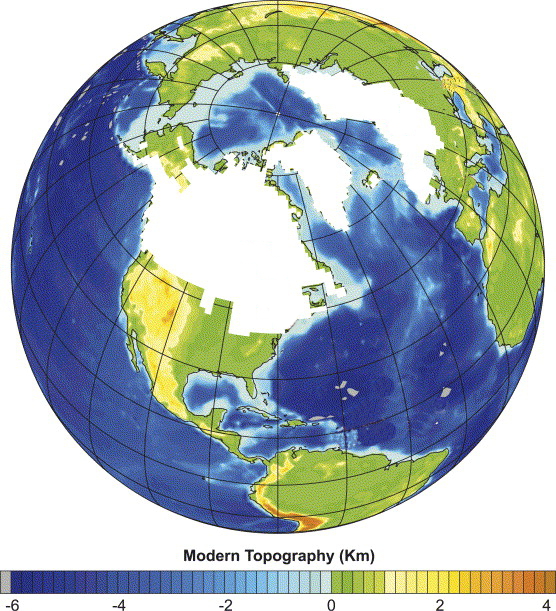 From this graph we can readily see that when 10-12°C gives you close to 200 metres of sea level change each degree means a lot. This image conveys the extent of the continental ice sheets during the Last Glacial Maximum about 22,000 years ago: