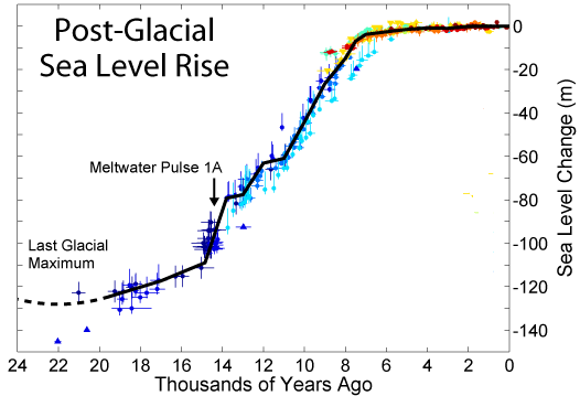 We know that coming out of the Last Glacial Maximum SLR was very rapid at times. About 14,000 years ago Meltwater pulse 1A yielded SLR of about 20m in less than 500 years, perhaps just 200 years.