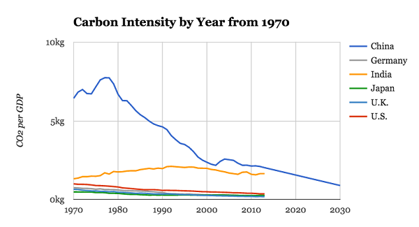China is looking at different kinds of measures, for example, it aims to reduce its carbon intensity, the amount of carbon dioxide emitted per unit of GDP, by 60 to 65 percent of 2005 levels by 2030. This graph charts its progress: