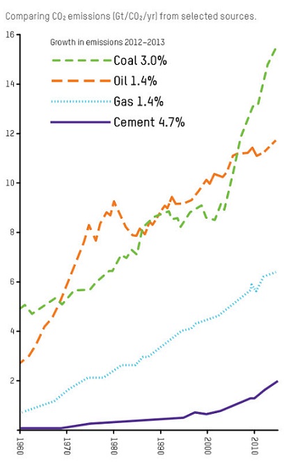 Update: The “renaissance of coal” arguments by Ottmar Edenhofer and others were not supported by statistics. Oxfam has recently issued a report Powering up against poverty: Why renewable energy is the future. Oxfam gives the impression that renewables are rapidly taking over from coal, especially in rural areas beyond the grid. Yet the report contains this graph of emissions from fossil fuels, at least up until 2013: