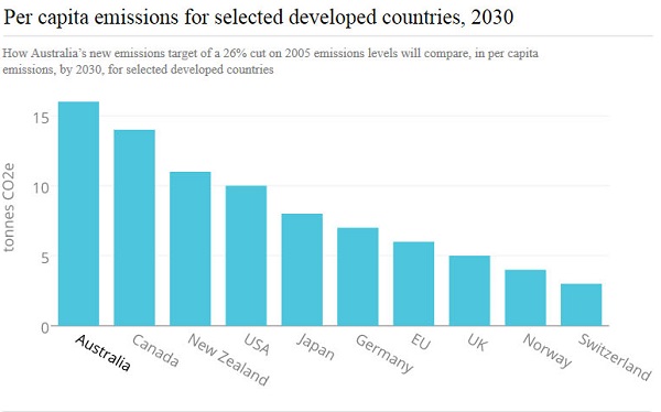 The target chosen for 2030 is a reduction of 26%, or perhaps up to 28%, on 2005 emissions. Using 2000 as the base year the reduction is only 19%, compared to the 40 to 60% recommended by the Climate Change Authority. On the face of it, the target is just ahead of Japan, which is struggling with a dodgy fleet of nuclear power stations, and just behind Canada and New zealand. Sophie Vorrath and Giles Parkinson cut the figures various ways. Abbott points to our population growth. The bottom line, though, is that we head the pack in emissions per capita. In 2030 will still win the per capita prize and have the most carbon intensive economy in the OECD.