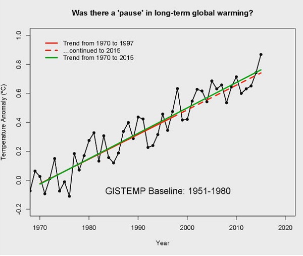 In case you still think there was a pause, RealClimate provides the trend lines: