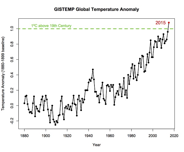 - Global temperature in 2015 was +1.13°C (~2.03°F) relative to the 1880-1920 mean.