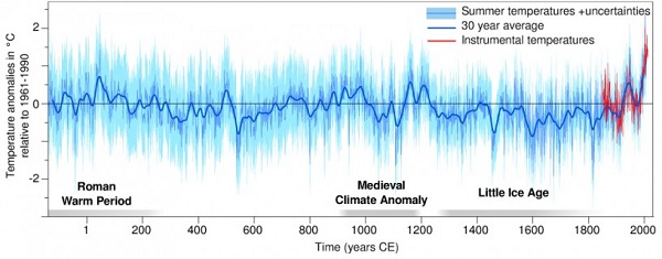 Scientists have done a careful reconstruction of Europe’s temperatures back to 138 BC. This is what they came up with: