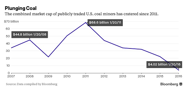 This graph from the article shows that the market capitalisation of American coal miners had decreased by 94% since its peak in 2011: