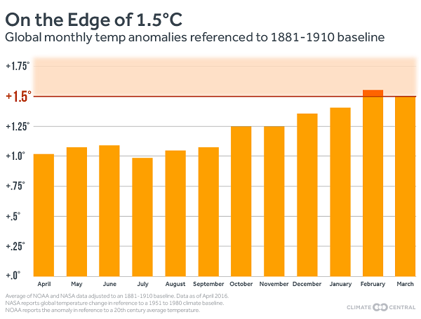 According to Climate Central the first three months of the year were 1.48°C above the 1881-1910 average temperature baseline, which is about as close as we can get to “pre-industrial”. Climate Central call it early industrial. Would you believe NASA reports global temperature change in reference to a 1951-1980 climate baseline, and NOAA reports the anomaly in reference to a 20th century average temperature? Both of these already contain significant warming.