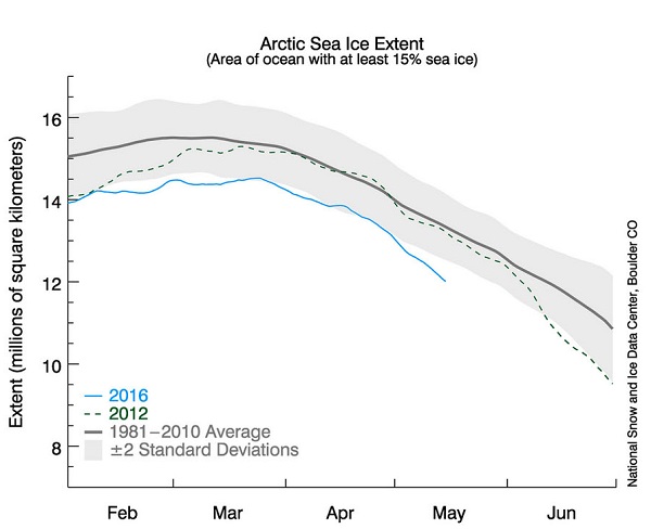With April coming in the same as January, we have probably seen the peak of the El Niño effect. Nevertheless NASA climate modeller Gavin Schmidt tweeted that there was a greater than 99% chance 2016 would be a new record. With a bit of luck 2017 will be less warm.
