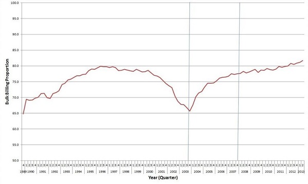 On the box Matthias Corman said the bulk billing rates were over 80% and had continued to rise under the LNP. That surprised me, but may not be far from the truth. An article in the Oz (paywalled, but Google Sean Parnell Bulk-billing rates have continued to rise under the Coalition) says: