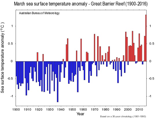 Back to David Spratt, who addresses the grim reality – the 1°C of warming we have now is already too much, and that 1°C will turn to at least 1.5°C before the earth reaches equilibrium. Again via Roger Jones, the sea surface anomaly this tear reached 1.5°C above the 1961-1990 average: