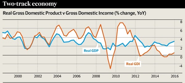 - Living standards shrank 2.6 per cent in the 15th straight quarter of falling or stagnant real net national disposable income per capita.