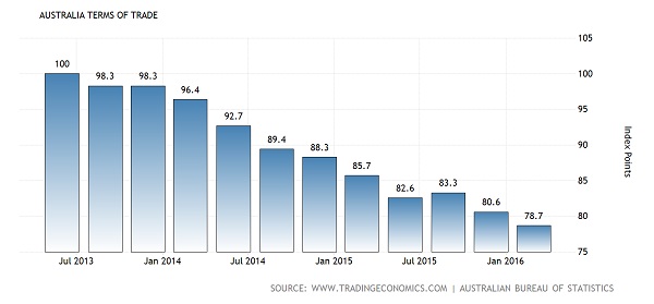 - Terms of Trade in Australia averaged 67.12 Index Points from 1959 until 2016, reaching an all time high of 118.50 Index Points in the third quarter of 2011 and a record low of 49.30 Index Points in the fourth quarter of 1986.