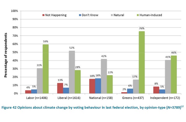 Secondly, 65% of Liberal voters either think climate change is not happening or is natural, not caused by humans. That’s actually worse than National voters, where the number is 60%.