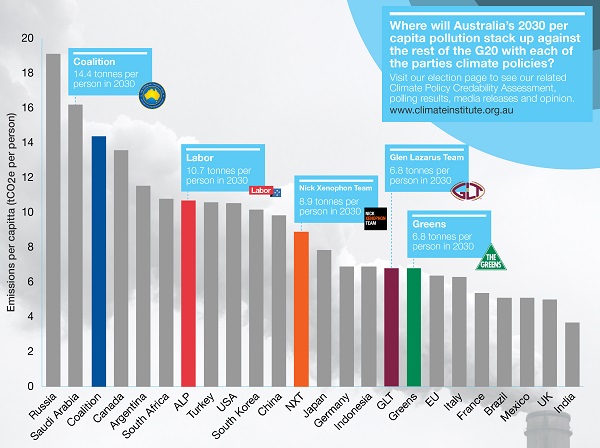 Climate change should have been a red hot issue in the election, but it didn’t grip, as Graham Readfearn reported just before the election. The title of his story has the message, there was a “tragic lack of leadership”. Climate change remained a second tier issue. The Climate Institute charted the party policy effects by 2030: