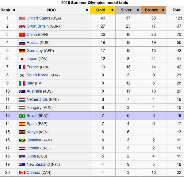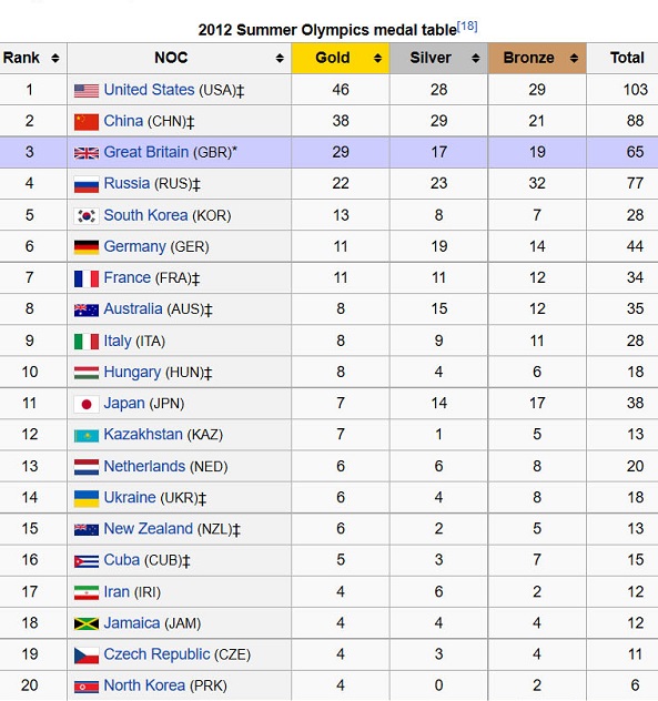 That’s ranked according to gold medals won, then silver, then bronze. There are other ways of doing the calculations.