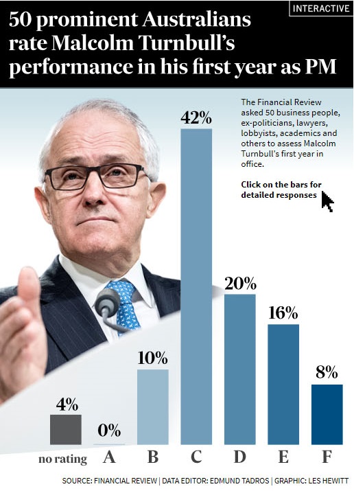 Last week Turnbull was in a muddle and so mired that Aaron Patrick at the AFR gave him a D-. This is how he was scored by 50 business leaders, former Liberal politicians, academics, economists, administrators, lawyers and lobbyists: