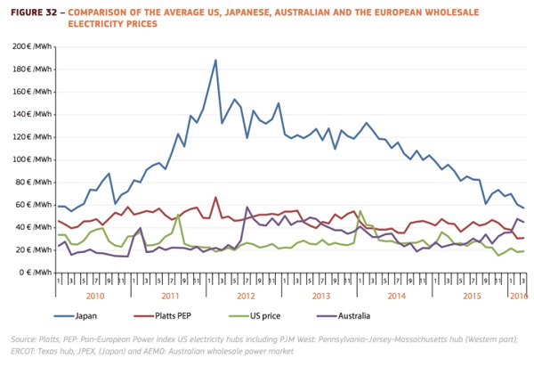 Largely because of gas, Sandiford says, we have in just 18 months gone from having cheaper power than the US and Europe, to having more expensive power, and rapidly converging with Japan, as they restore their nuclear capacity: