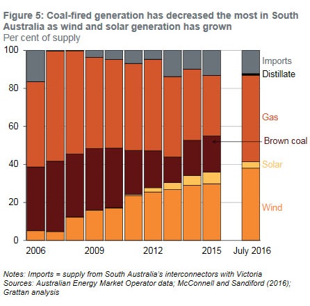 South Australia has a similar, actually larger, penetration of renewables, but here’s their mix, from the Grattan report: