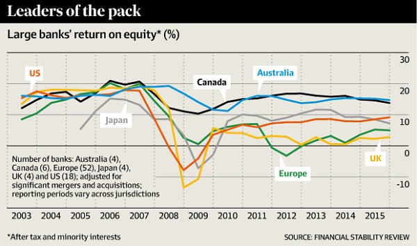 Joanna Mather in the AFR reports that Labor is going to give banks a hard time when the front up in Canberra next week. That’s fair enough, but they have the impression banks are too profitable. This graph shows their return on equity in relation to the European and US banks: