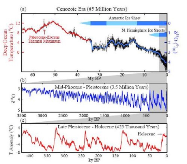 For most of the last 65 million years there has been a cooling trend. The second feature that stands out is the sharp oscillation of temperatures, in and out of what we call ice ages during the last 3.5 million years. If you expanded the graph you would find that the cycles conform with the rhythm of the obliquity, or axial tilt cycle, which occurs in 41,000-year periods.