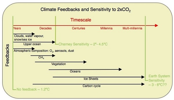 There are two concepts we need to get our heads around. First there is climate sensitivity, the amount of warming we get from a doubling of CO2. The second is often described as the Earth System Sensitivity (ESS), which includes the long-term effects over millenia as ice sheets, vegetation and atmospheric dust continue to respond to global warming. Schmidt has this useful diagram: